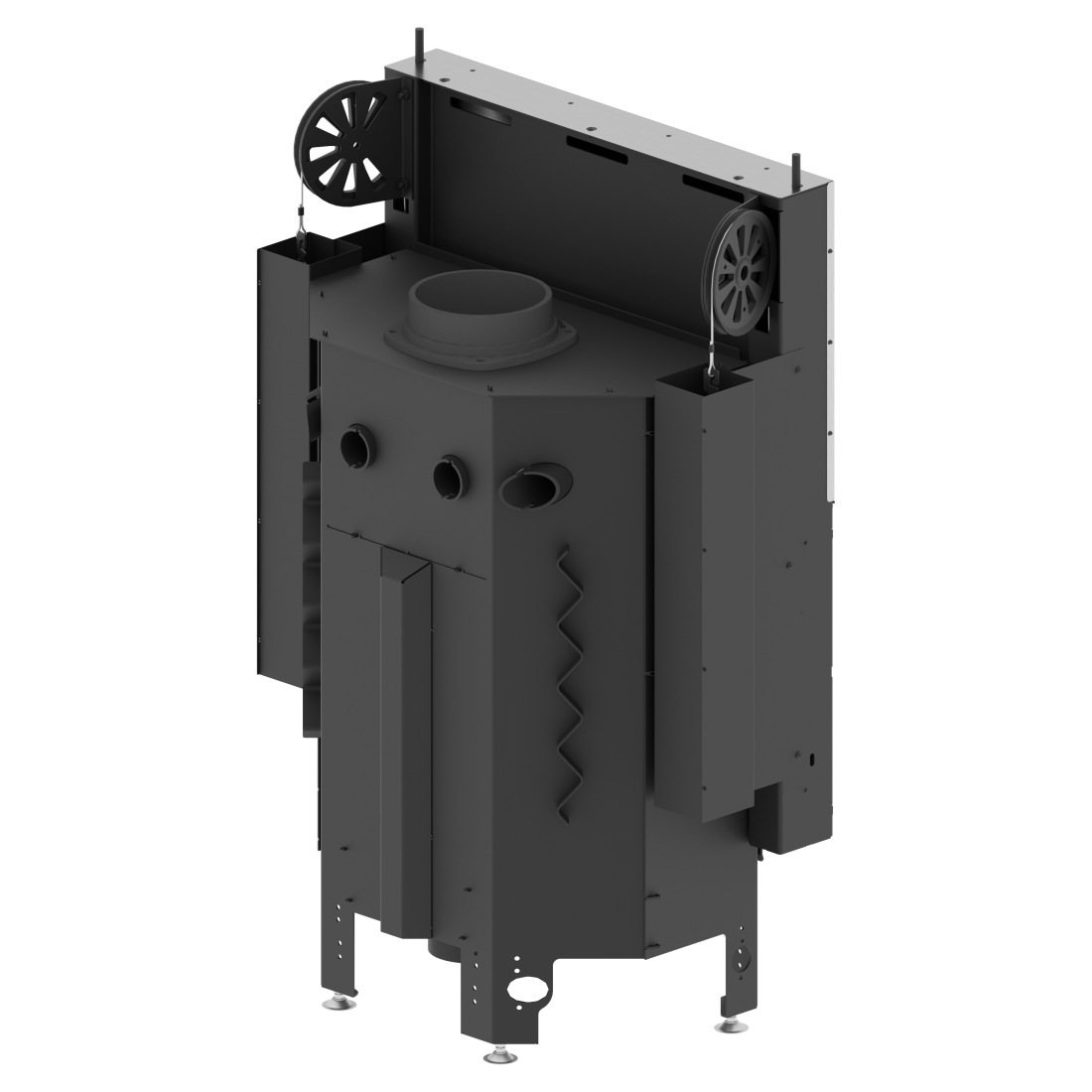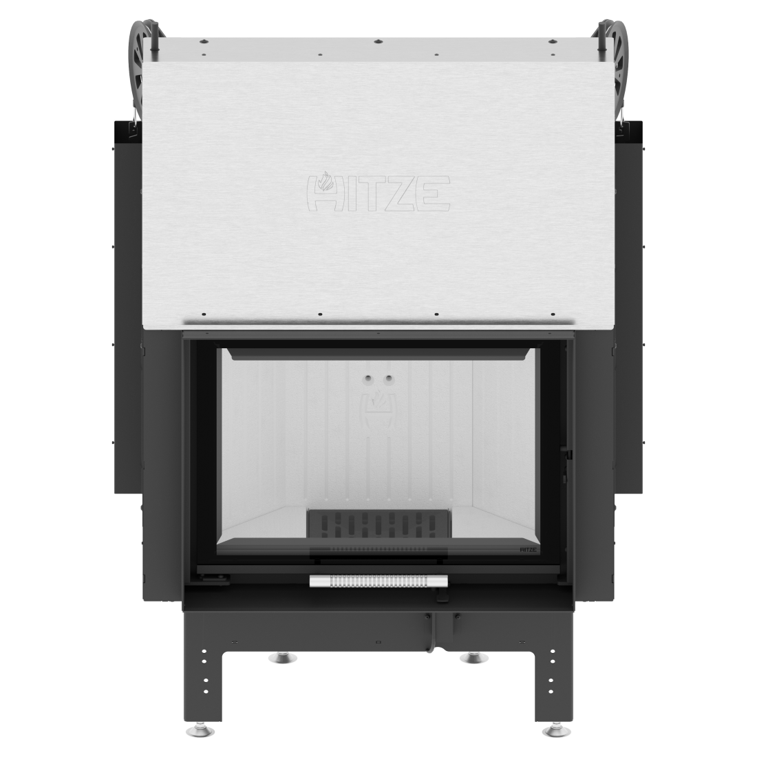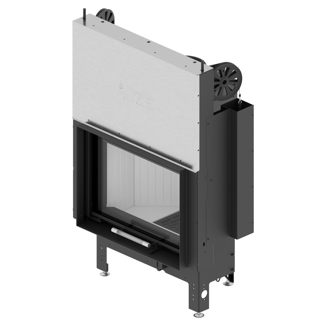 Ενεργειακό τζάκι αέρος 11 kW κατασκευασμένο από χάλυβα ποιότητας P265GH, εξοπλισμένο με ρυθμιζόμενη εισαγωγή αέρος πρωτογενούς και δευτερογενούς καύσης, ενεργειακής απόδοσης 84 %.