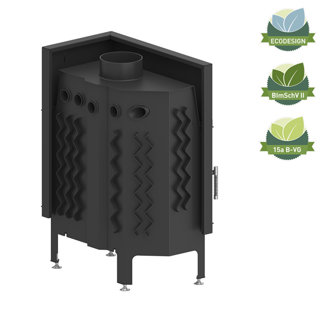 Ενεργειακή εστία αέρος ALBERO 14 kW κατασκευασμένο από χάλυβα ποιότητας P265GH, πιστοποιημένο βάσει BImSchV-II, ECODESIGN και 15a B-VG. Eξοπλισμένο με ρυθμιζόμενη εισαγωγή αέρος πρωτογενούς και δευτερογενούς καύσης, υψηλής ενεργειακής απόδοσης.