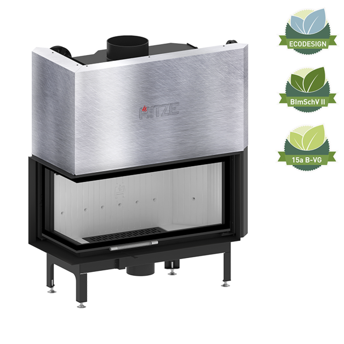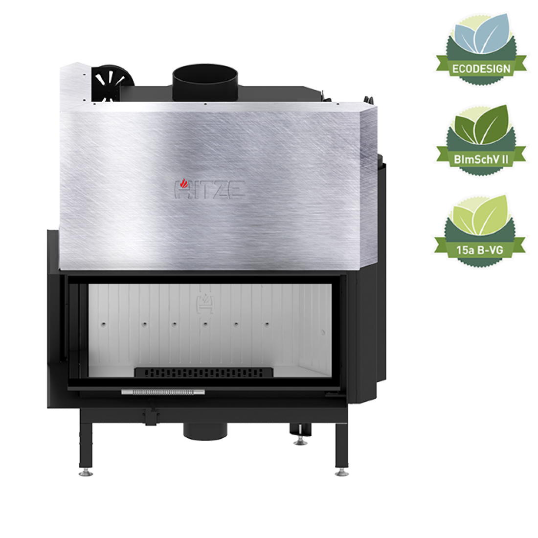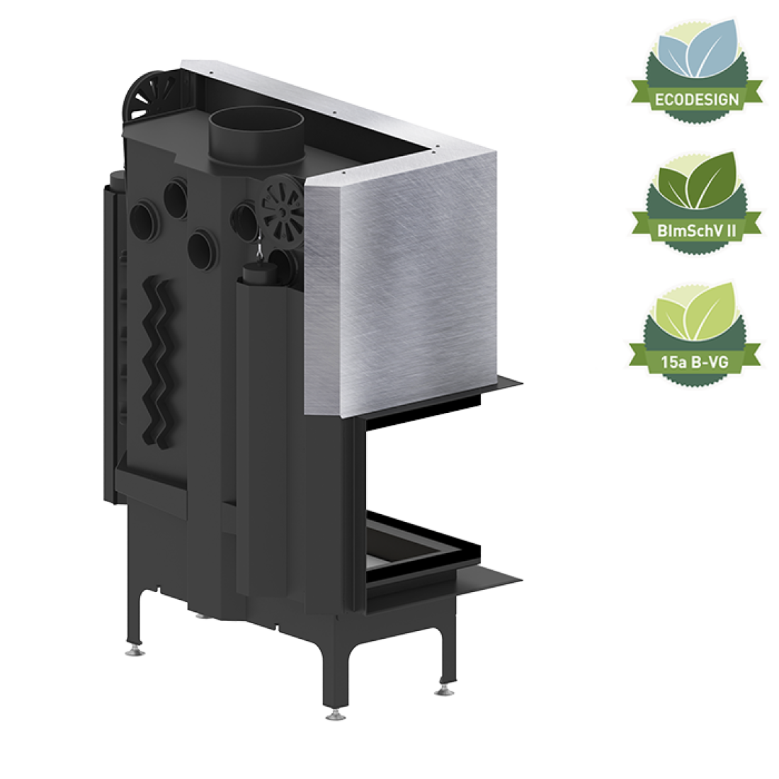 Ενεργειακό τζάκι αέρος ALBERO 19 kW κατασκευασμένο από χάλυβα ποιότητας P265GH, πιστοποιημένο βάσει BImSchV-II, ECODESIGN και 15a B-VG. Eξοπλισμένο με ρυθμιζόμενη εισαγωγή αέρος πρωτογενούς και δευτερογενούς καύσης, υψηλής ενεργειακής απόδοσης.